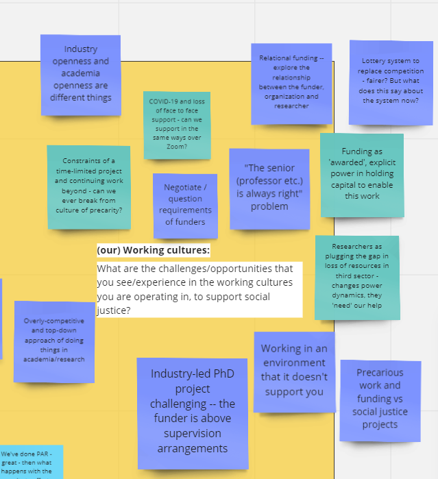They discussed their experiences of navigating power dynamics, and looked at their own institutional working cultures. They broke into groups to reflect on different areas: negotiating positionality and reflexity, community activism, changing academia, and power dynamics in context.