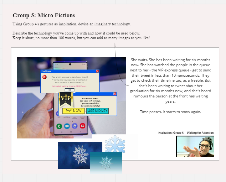 As part of the workshop, they took photos of gestures representing an experience they had at the intersection of digital technology and social justice, and then in groups they created microfictions about imaginary technologies in response to these gestures.