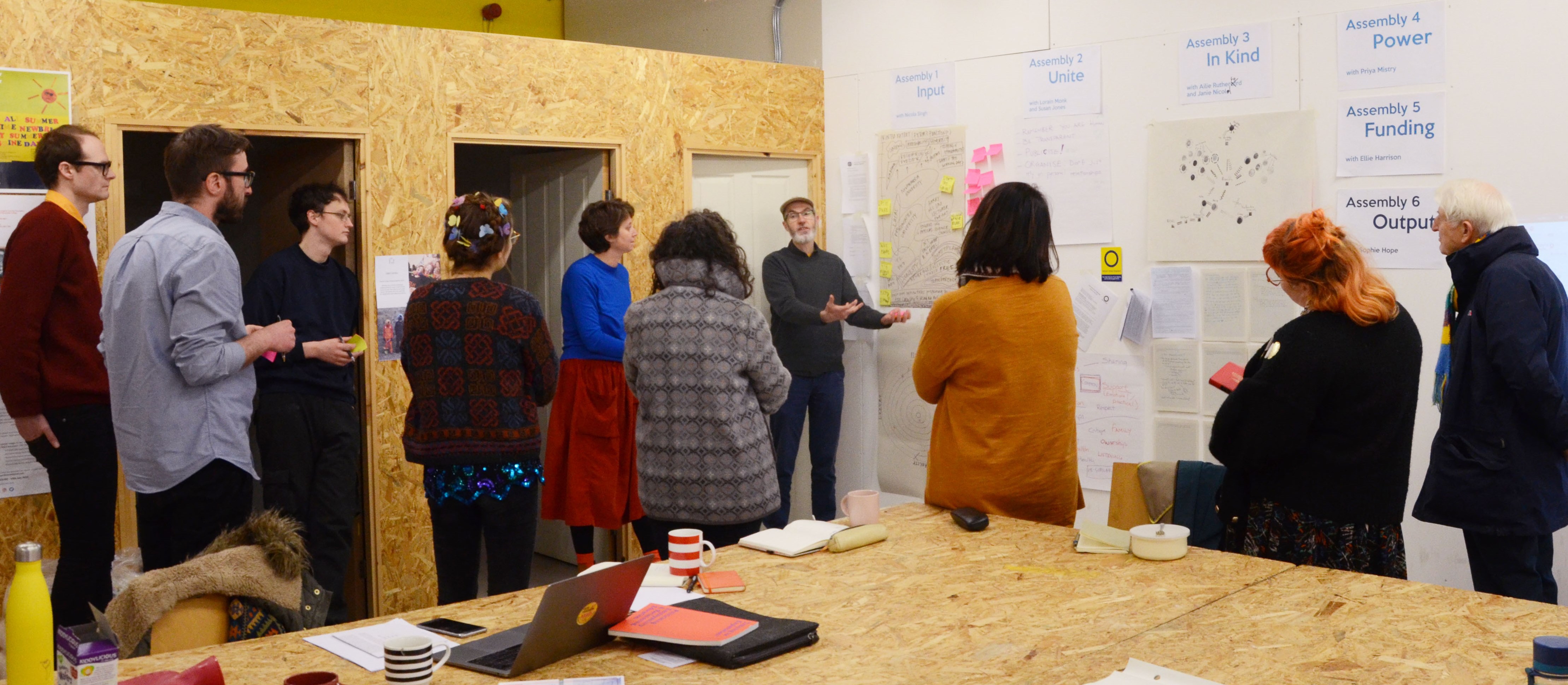 Nicola Singh’s first workshop, ‘Input’, promoted self-reflection on the project, and centred on various mapping exercises through which to understand the institutional network that Assembly was imbricated within. Subsequent events focused on unionisation in the arts sector, the proliferation of unpaid and ‘in kind’ work in art, diversity and representation within the sector, and alternative funding strategies and sources.
